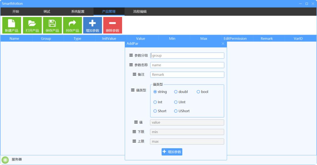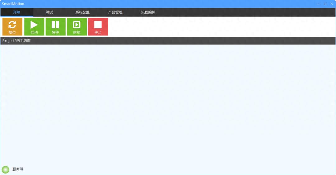 可以在图形界面中切换自动运行、手动调试、产品管理、流程编辑等不同工作区,并通过统一的控制面板(启动、暂停、回零等)触发全局操作。