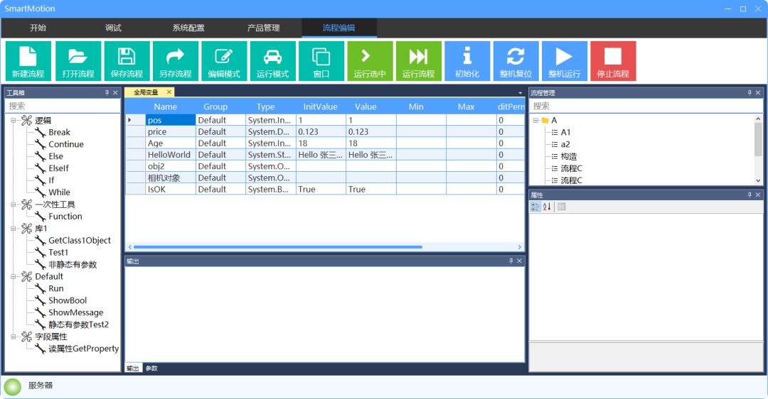 4、集成类 IDE 界面布局包含工具箱、解决方案资源管理器、属性面板、调试输出、变量/参数窗口等,支持自定义布局并持久化保存。