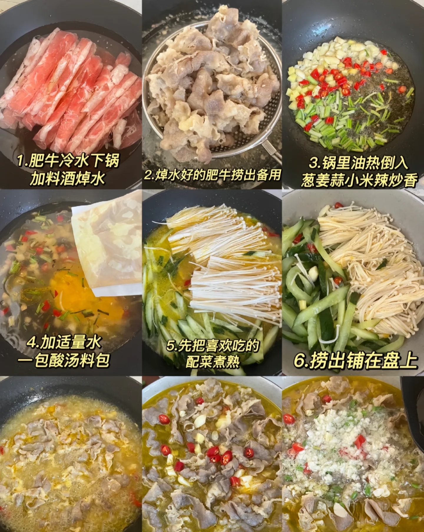 酸汤肥牛教程【食材】肥牛卷200克、金针菇1把、酸菜150克、泡椒、姜蒜、干辣椒、花椒。【灵魂调料】酸汤肥牛料包(最方便