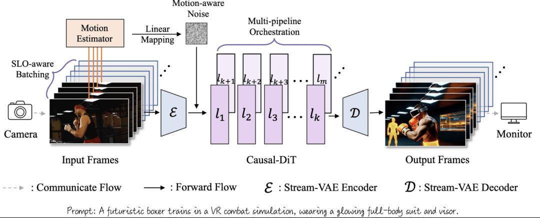 实时 SLO 无法满足:现有视频扩散模型主要面向离线生成优化,虽然提升了整体吞吐量,却显著拉高了首帧延迟,且难以满足直播场景对每一帧严格时限和低抖动的服务级目标(SLO)。 长时间生成中的时序漂移:主流视频扩散系统在持续运行的直播场景中,内容分布与用户输入会不断变化,加剧了自回归视频生成模型的误差累积,导致生成过程中出现风格漂移和时间一致性退化。 高速动作下的画面撕裂:现有模型多基于慢动作或平稳运动数据训练,在面对快速镜头切换或剧烈运动时表现受限,生成中发生模糊、重影和动作撕裂等问题。 难以实现多 GPU 扩展:现有的序列并行带来大量通信开销抵消了计算的加速。在以单帧延迟为主导的实时负载下,无法扩展到多 GPU 并行推理。综上所述,这些挑战表明,实时视频扩散无法仅依赖离线生成范式的延伸,而亟需一种从系统层面重新设计、以实时约束为核心目标的推理架构。