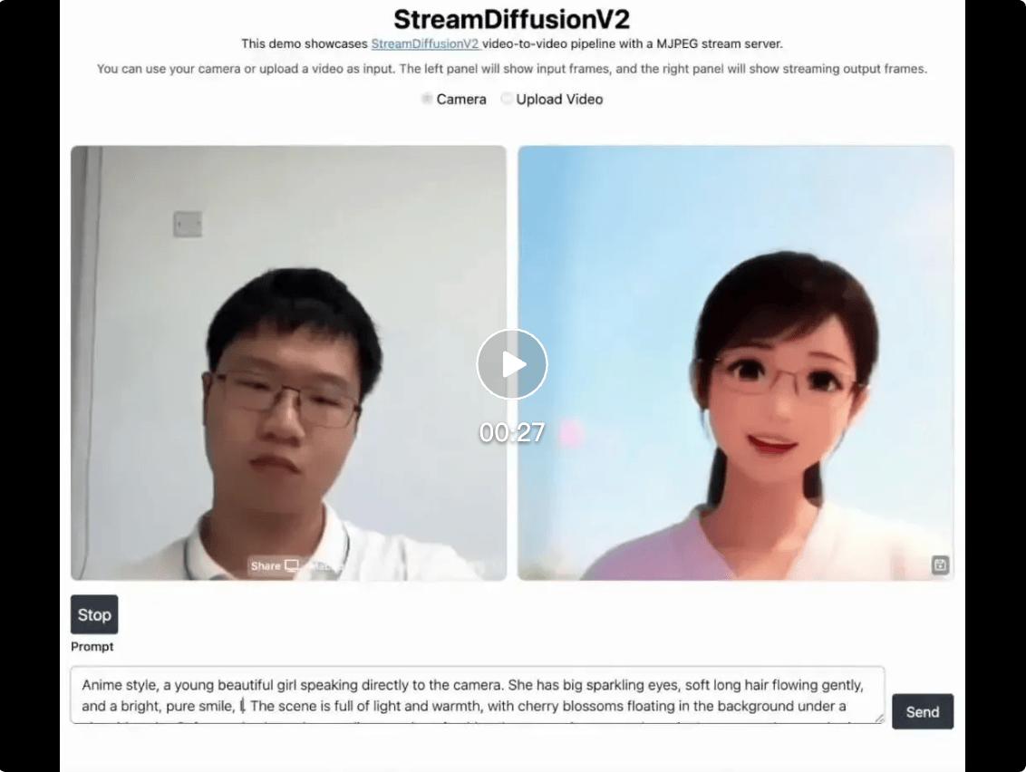 StreamDiffusionV2 弥合了离线视频扩散与实时直播之间长期存在的系统鸿沟。使高质量生成式直播首次具备工程可行性。