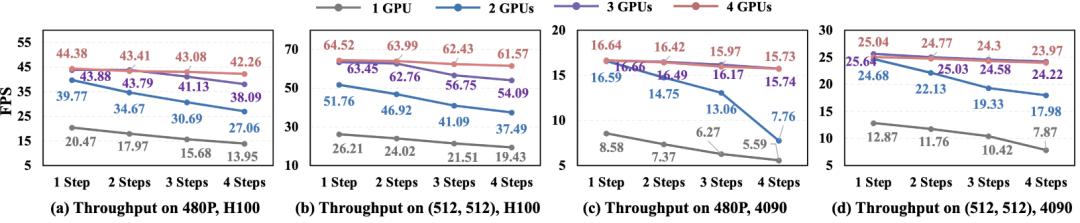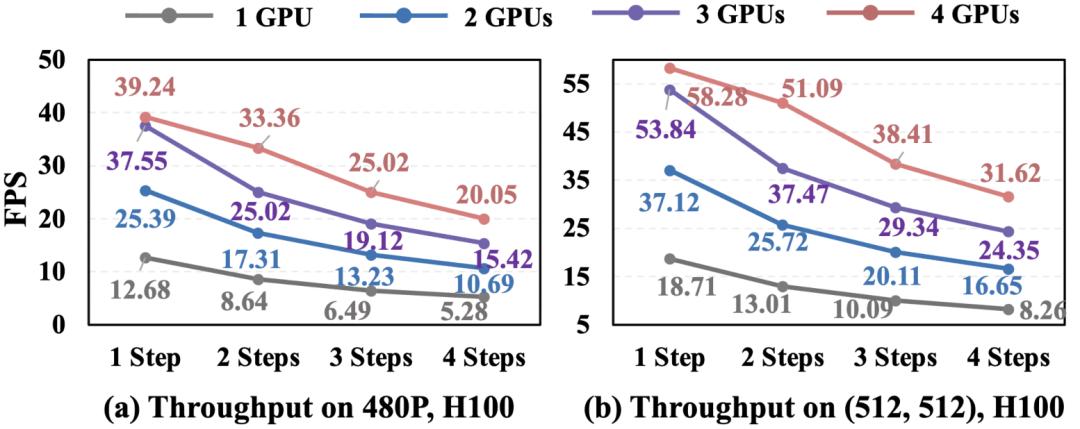 StreamDiffusionV2 已全面开源,对个人用户部署友好,在未应用 TensorRT 或量化的情况下,能够在仅配备双卡 RTX 4090 的设备上稳定 16 FPS 实时推理。其在 H100 上首帧延迟低于 0.5 秒,并在 4 卡设备上稳定实现 14B 模型 58.28 FPS、1.3B 模型 64.52 FPS 的吞吐量。