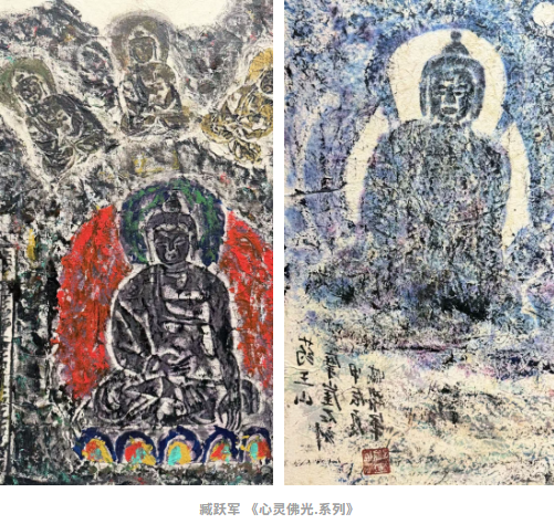 臧跃军将军旅生涯的坚毅与西藏文化的深厚底蕴融于创作之中,运用藏纸、藏香、矿物质颜料等综合材料,在传统与现代之间构建起独特的艺术语言。其作品斑驳陆离的画面背后,是艺术家对高原大地挚爱之情的真挚流露。