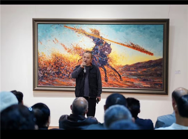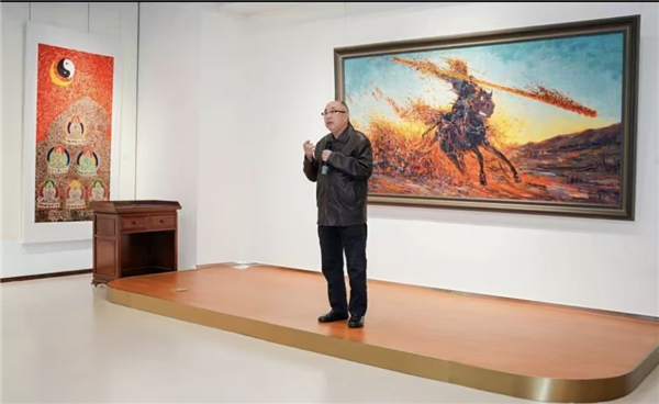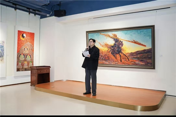 四川大学教授、博士生导师吴永强随后致辞,由其学生王旭明代为宣讲,深刻阐释了展览的学术价值:“臧跃军与邱光平两位艺术家,一位深耕西藏高原,以综合材料重构藏地美学;一位直面当代精神荒原,以马为喻叩问生命本质。他们在艺术探索中各自抵达了极致之境,这场'极地双生'的对话,不仅是艺术语言的碰撞,更是精神高度的共鸣。”