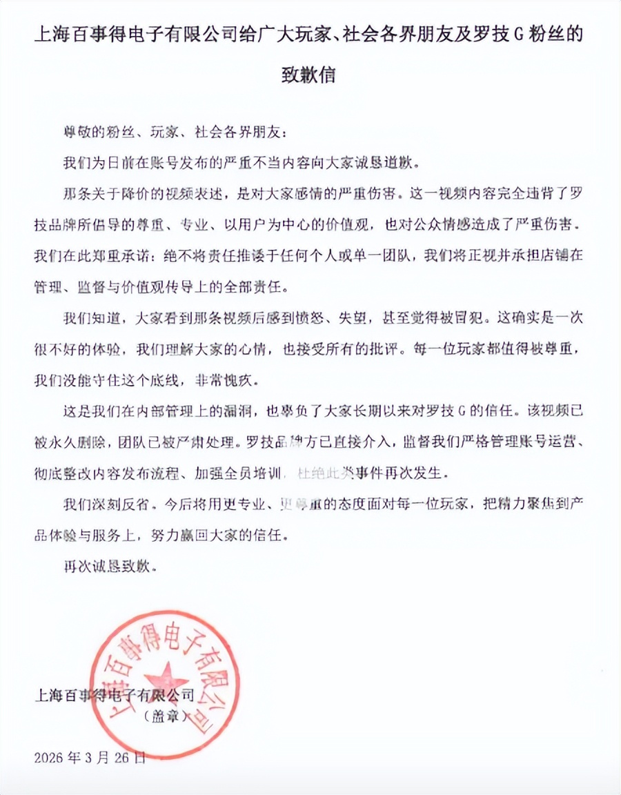 面对汹涌的舆情,当天深夜,@罗技中国就发了一份“极其标准”的致歉声明。
