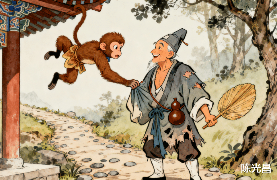 灵台山的猴子阿空,自打上回偷了老君的金丹被追得满天庭乱窜,就没过上一天安稳日子。这天它正蹲在山神庙的房梁上啃野果,忽闻一阵酒香飘来,低头一看,只见个破衣烂衫的和尚摇着蒲扇路过,腰间挂着的酒葫芦泛着金光。阿空眼睛一亮,这葫芦里的酒闻着比蟠桃宴上的玉液琼浆还香,它一个纵身就蹿了下去,拽住和尚的衣角:“和尚,你这葫芦借俺老孙…… 哦不,借俺阿空尝尝!”
