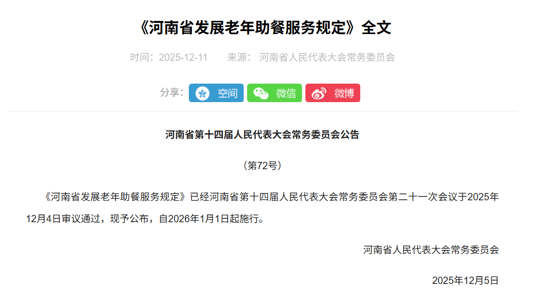 近日,河南省第十四届人民代表大会常务委员会第二十一次会议审议通过了《河南省发展老年助餐服务规定》,该规定自2026年1月1日起正式施行。