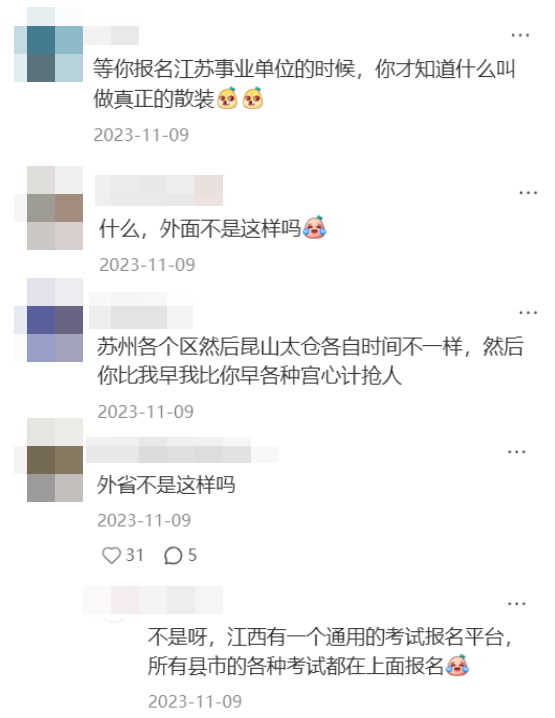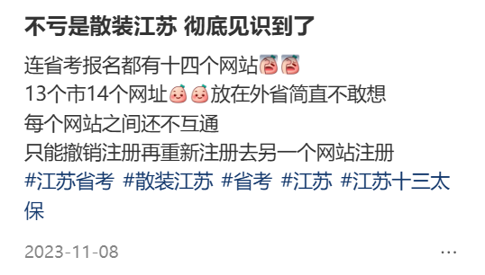 比如有考生报考江苏省考的时候都懵了,因为他们每个市都有自己的报考网址。网友吐槽这件事的时候,居然还有江苏网友好奇地问:外省难道不是这样的么?