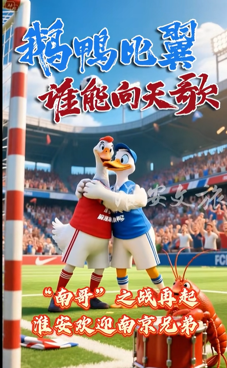 淮安和南京,麻辣鹅对战盐水鸭,淮安官号放话“谁能向天歌”。海报看似其乐融融,但网友怎么看都觉得鹅要比鸭子高上一头。