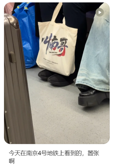 最近还有网友在地铁上看到了二创周边,虽然只是很朴素的帆布包,但上书“以前我是通仔,叫南哥”以及“我以为你们只是考试不行,没想到足球也不行”,简直对南京贴脸开大。