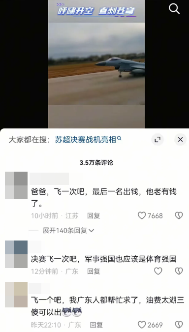 据说现在江苏网友甚至还跑到“东部战区”的账号评论区里,求官方出动战斗机助阵,因为美国的超级碗橄榄球比赛每年都有战机巡回的名场面.....