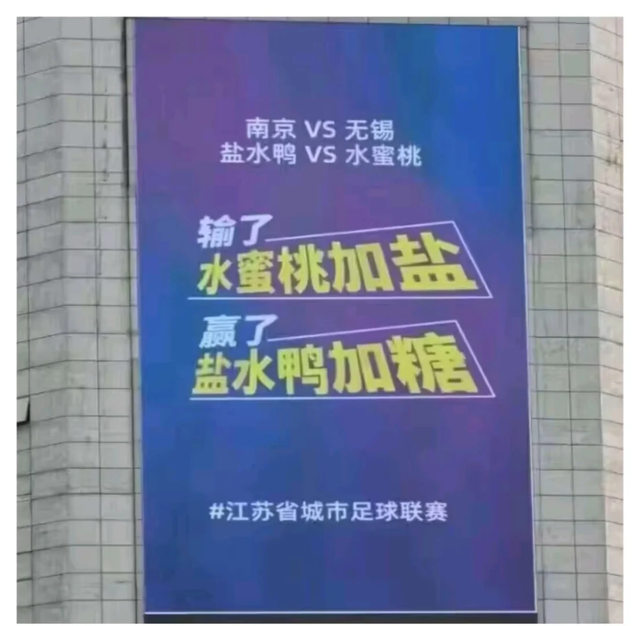 另外无锡更是在本地商场的大屏幕上放狠话,说无锡输了以后水蜜桃加盐,南京输了以后盐水鸭加糖,那真是有够狠的。