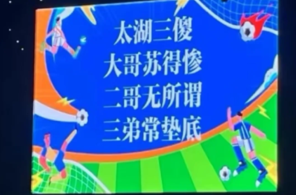 截至第三轮比赛,苏超排名最后的三个城市分别是苏州、无锡、常州。围在太湖附近的这哥仨曾因为经济发达被夸成“太湖三霸”,结果几场足球赛过去,三霸已经变成“太湖三傻”。