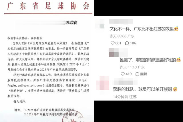 但评论区的网友们显然更兴奋,出谋划策说不如分开搞广府杯、潮汕杯、客家杯,或者谁赢了就承认哪里的鸡最好吃,还有人撺掇上海每个区出一支战队打沪超......