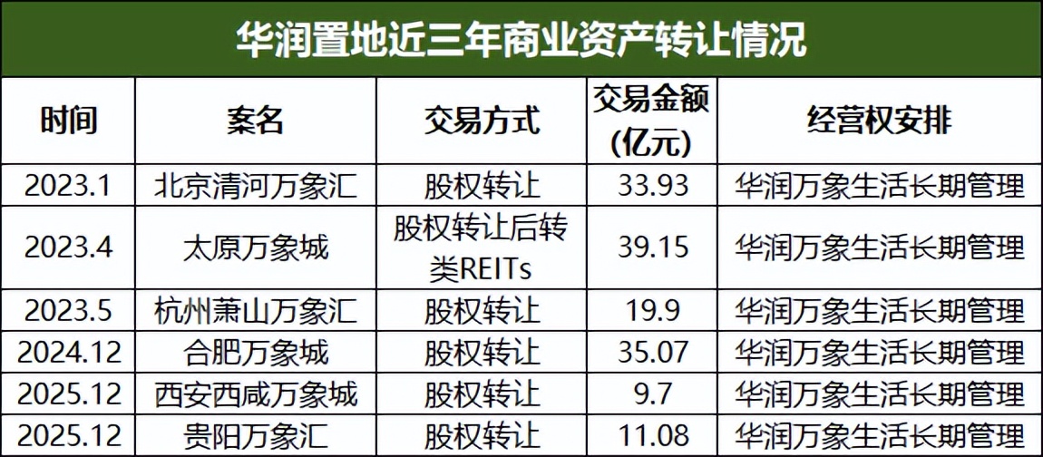数据显示,从2023年至2025年,华润置地以转让商业地产项目股权但保留长期运营管理权的方式先后将杭州萧山万象汇、北京清河万象汇、合肥万象城等6个已经运营成熟的项目股权挂牌转让。
