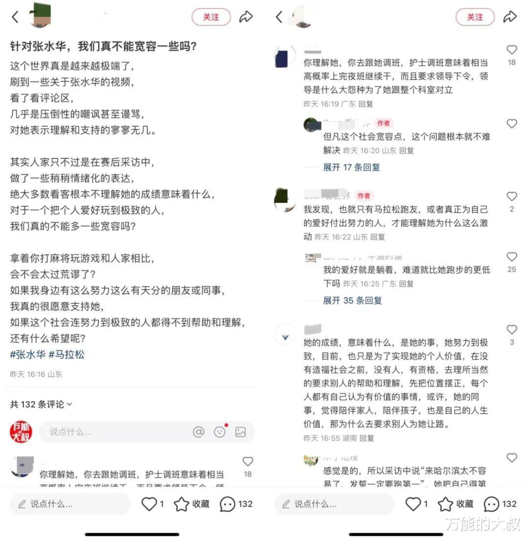 “这个世界真是越来越极端了……看了看评论区,几乎是压倒性的嘲讽甚至谩骂,对她表示理解和支持的寥寥无几,其实人家只不过……做了一些稍稍情绪化的表达……对于一个把个人爱好玩到极致的人,我们真的不能多一些宽容吗?……如果我身边有这么努力这么有天分的朋友或同事,我真的很愿意支持她,如果这个社会连努力到极致的人都得不到帮助和理解,还有什么希望呢?”