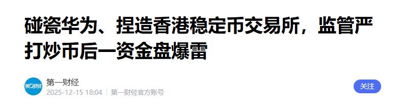 信息来源:《碰瓷华为、捏造香港稳定币交易所,监管严打炒币后一资金盘爆雷》第一财经2025-12-15 18:04