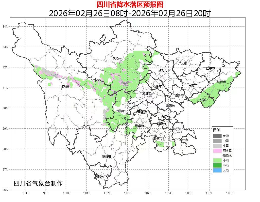预计2月28日到3月2日,盆地大部有阵雨或小雨,局地有中雨,气温将有所下降,注意加衣防感冒;川西高原北部东部有阵雪(雨),局地中雪(雨),需防范雨雪天气和道路结冰带来的不利影响。