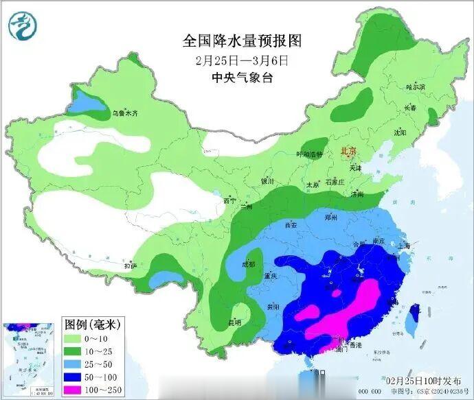 2月25日至27日、2月28日至3月2日,黄淮及其以南将先后有两次大范围降水过程,其中贵州中东部、湖南、湖北东部和南部、江西、苏皖中南部、浙江西部、广西北部、广东、福建等地的部分地区有中到大雨,局地暴雨。
