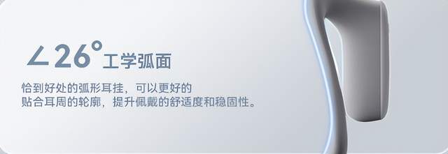 耳机的耳挂采用天鹅颈结构设计,可轻松适配眼镜,让戴眼镜的人群也能舒适佩戴;同时单耳仅 9.5 克的轻量化设计,佩戴时可以减少了耳部的压迫感;耳机还支持 IPX4 防水,平时出汗或者遇到小雨,都不用怕会影响它使用。再加上黄金角度拐点设计,即便是长时间佩戴,也不容易出现酸痛问题,全方位兼顾舒适与实用性。