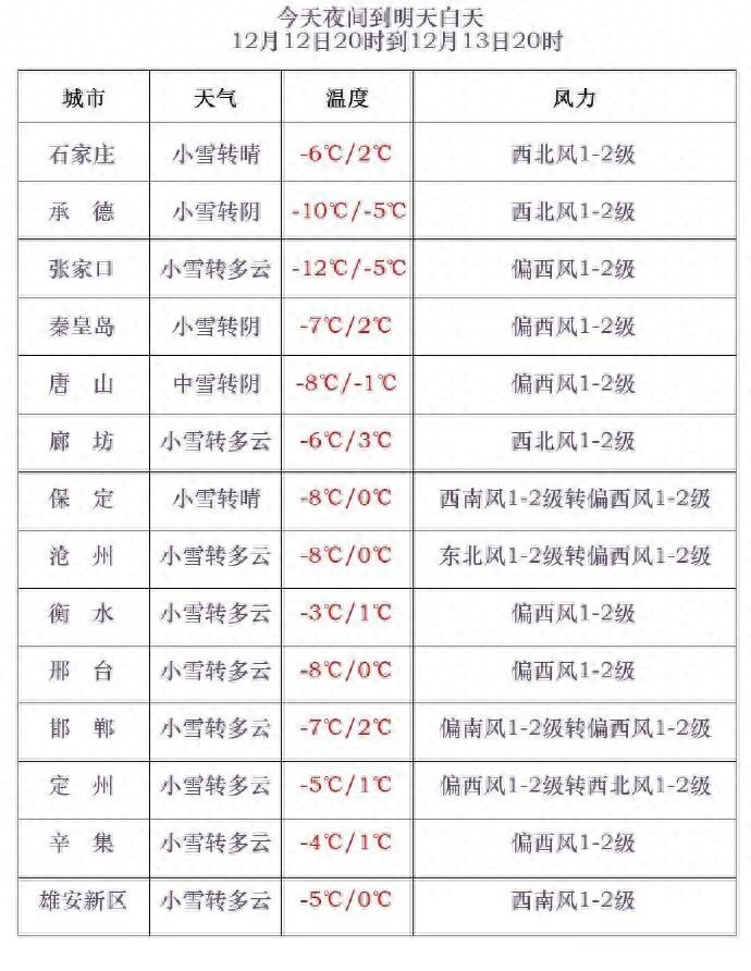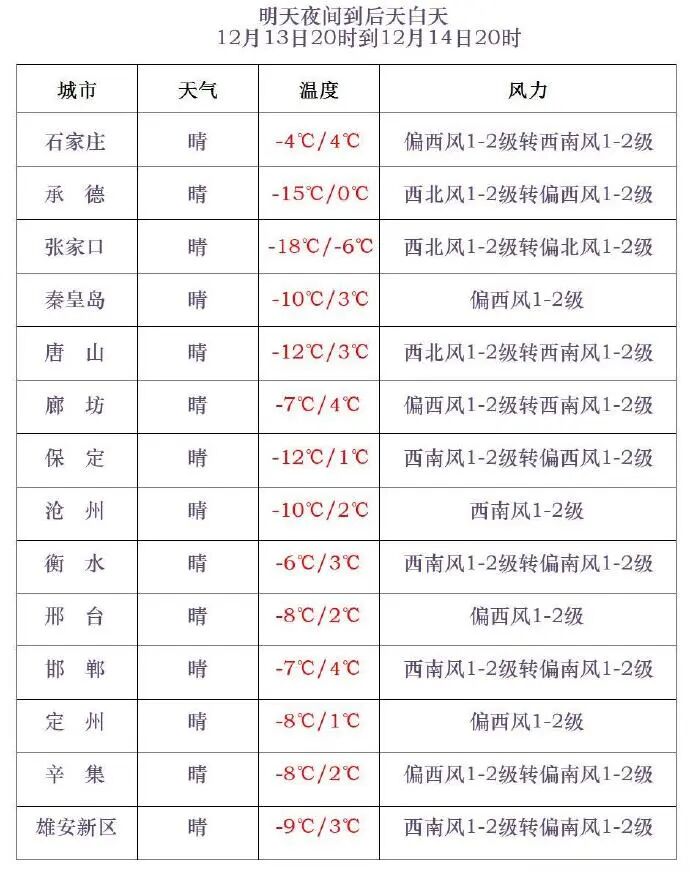 14日早晨,张家口、承德、唐山北部、秦皇岛北部、保定西北部最低气温降至-19~-13℃,其中坝上地区降至-23~-20℃;其他地区降至-12~-4℃。