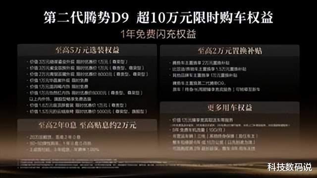 为感恩新老用户的支持和信赖,即日下订第二代腾势D9,可享至高价值超10万元限时购车权益!包含12个月免费闪充权益以及2年0息或3年低息等金融方案。此外,本次置换权益诚意十足:腾势车主可以享受2万元的置换补贴,比亚迪或者奔驰车主可以享受1.5万元的置换补贴,其他品牌车主也可以享受1万元的置换补贴。