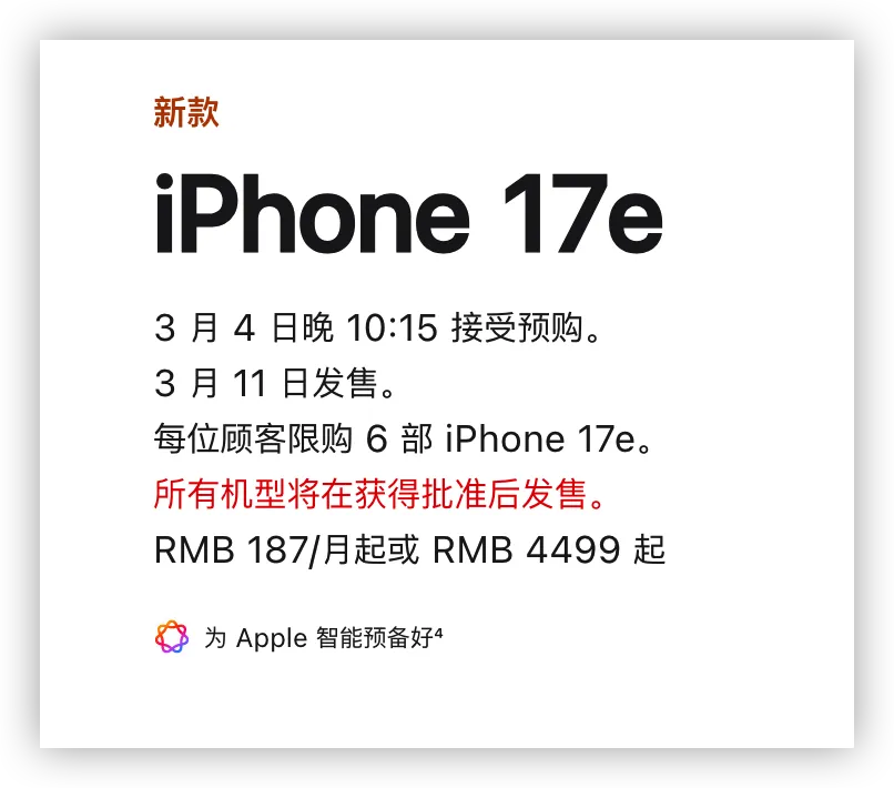 iPhone 17e 将于3 月 4 日晚间 10 点 15 分接收预购。