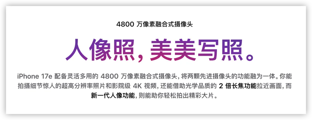 iPhone 17e 采用了 4800 万像素融合式摄像头系统。