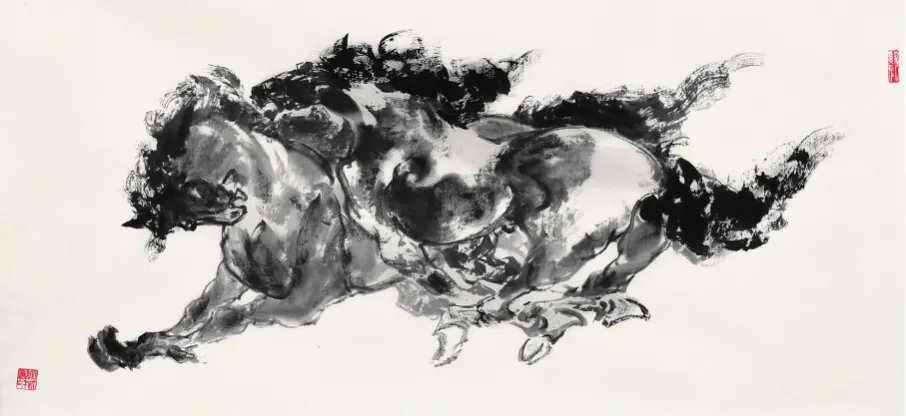 刘大林的骏马绘画在技法层面呈现出鲜明的个人特色,其笔墨语言经历了从工整写实到豪放大写意的演变过程。构图与空间的经营,展现了刘大林对传统绘画程式的突破与创新。他常将骏马置于高山、太阳、风雪或古树的背景中,通过自然元素与马匹的互动,构建富有戏剧性的画面空间。线条与墨色的交响,构成了刘大林骏马画最显著的形式特征。他笔下的马"四蹄生风,疾如闪电",通过极具节奏感的线条和富有张力的墨块,营造出"一种节奏轻快的旋律感和风姿绰约的动感"。在作品《风雪八骏》中,刘大林以疾速的笔触勾勒出马群在暴风雪中狂奔的壮观场景,马的鬃毛"烈烈"飞扬,整体气势"势如破竹"。这种动态表现不仅捕捉了马匹奔跑的物理真实,更传达出一种精神上的激昂与奋进。"