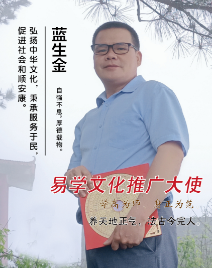 蓝生金,男,1968年生,壮族,大专文化,广西来宾市忻城县人,现任中国风水家协会会员、高级风水师,中国风水家协会广西珠西江流域分会常务理事长、易学文化推广大使、中华周易风水师。自1995年起,他便专注深耕风水领域,系统研习邵伟华、曲炜、刘文元等十余位全国知名易学大师的理论著作与实践课程,打下了坚实的理论基础。