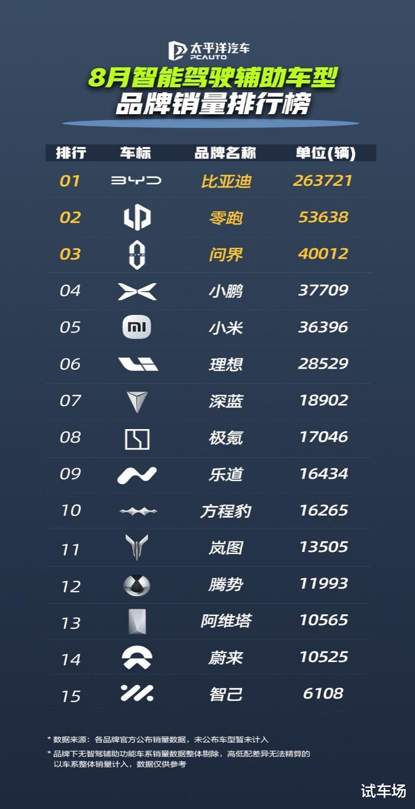 在太平洋汽车发布的8月智能驾驶辅助车型品牌销量榜中,比亚迪以26.37万辆一骑绝尘,其销量相当于第2至第10名品牌之和。此外,灵鸢车载无人机系统、首创兆瓦闪充技术的超级e平台等创新成果相继落地。首搭超级e平台的汉L、唐L持续热卖,为销量增长注入核心技术动力。