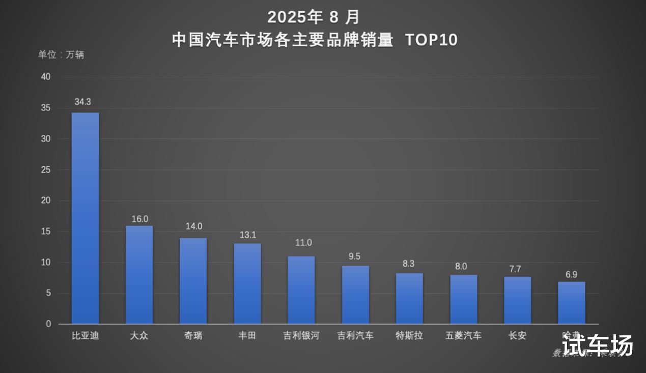 其中,比亚迪汽车(王朝丨海洋)8月销量达34.3万辆,1-8月单品牌销量263万辆,稳居销量冠榜首,并保持断崖式领先。
