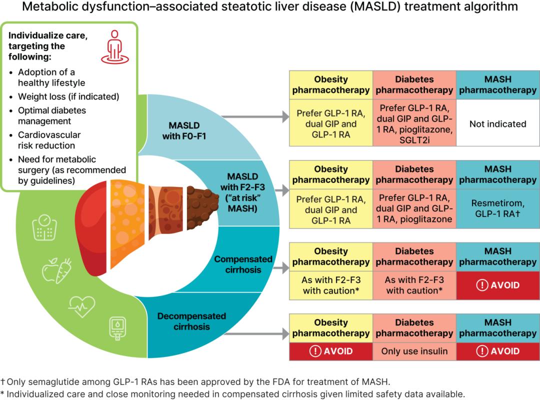 更新建议4.26,明确对于合并代谢功能障碍相关脂肪性肝病(MASLD)且存在超重或肥胖的2型糖尿病成人患者,可考虑使用已证实对非酒精性脂肪性肝炎(MASH)具有获益的GLP-1 RA进行治疗。