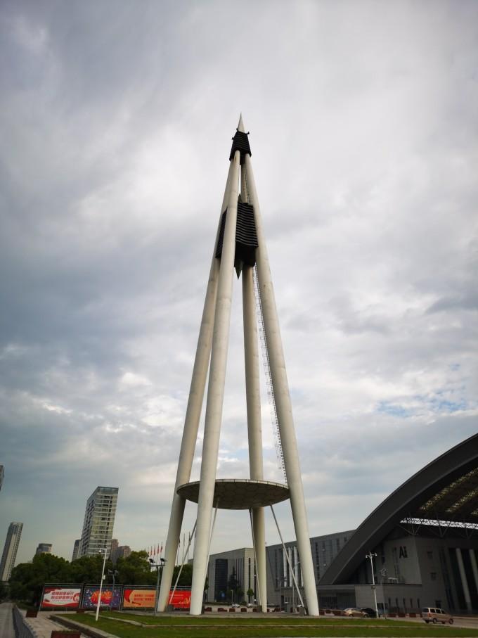 南门主入口前建有大型会展广场,广场中轴线上矗立着72米高的箭形标志塔,号称“定海神针”。 神针直插云霄,与主展馆弓型造型相映成辉,预示着 宁波 会展中心发展乘势而上。