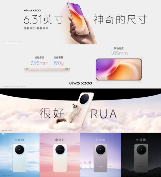 设计细节上,X300采用1.05mm超窄四等边屏幕,正面观感近乎“无边”,带来高度沉浸的视觉体验。背板运用丝绒玻璃工艺,不仅呈现高级光感,更提供温润细腻的触感;超简圆环镜头模组与机身自然融合,避免突兀凸起,整体风格简约而不失辨识度。7.95mm的厚度配合中框两端微曲设计,长时间握持也不易疲劳。屏幕本身为京东方Q10 plus护眼屏,支持1–120Hz自适应刷新率、2160Hz全亮度高频PWM调光,并覆盖100% P3广色域,兼顾流畅、护眼与色彩表现,日常使用体验全面拉满。