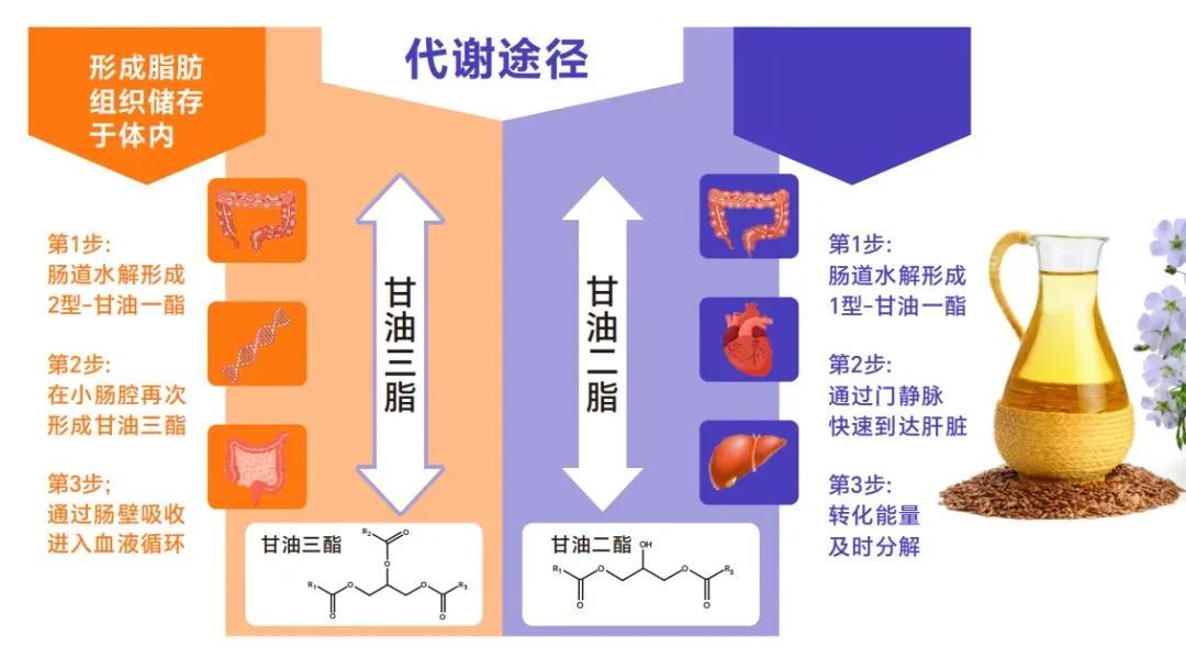 而二酯油的核心成分是甘油二酯,含量要求不低于40%。它的分子结构比甘油三酯少了一个脂肪酸链,这一差异直接改变了代谢路径:二酯油被分解后产生的产物,很难再合成甘油三酯进入血液循环,大部分会直接被肝脏代谢供能,会减少在体内囤积脂肪。