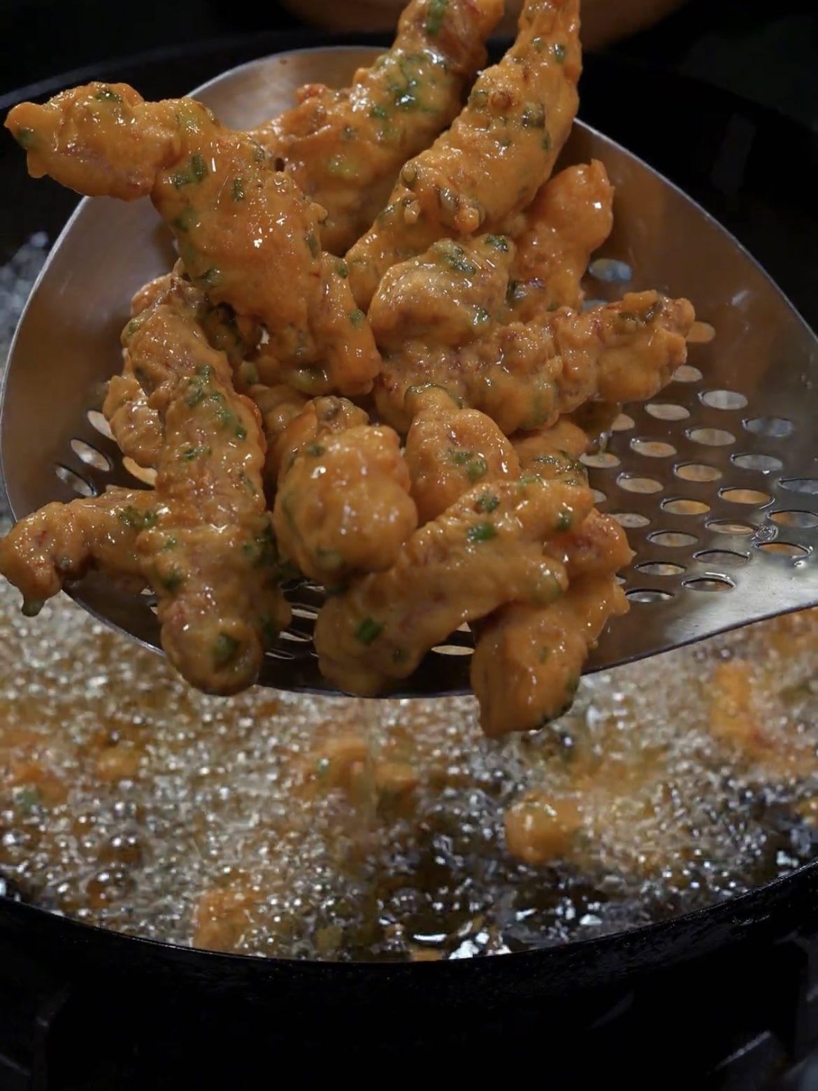 制作方法:首先把买回来的梅花肉洗净,切成均匀的条状,加入调味腌制:食用盐,胡椒粉和蚝油,生抽,以及姜末,用手抓匀后,淋入适量的食用油腌制20分钟。腌制时间快到后,拿出空碗,倒入两包小酥肉专用粉,打入两个鸡蛋,再少量多次的倒入清水,把它们调成酸奶浓稠状的样子,再倒入少许的食用油,搅拌均匀后倒入腌制好的肉,还有大量的葱花,把它们搅拌均匀,使每一块肉都能裹上面糊。接着起锅烧油,油温7成热,把裹好面糊的肉放进锅中炸,炸至微黄捞出后,等油温再次升高,回锅再复炸一遍即可开吃了。
