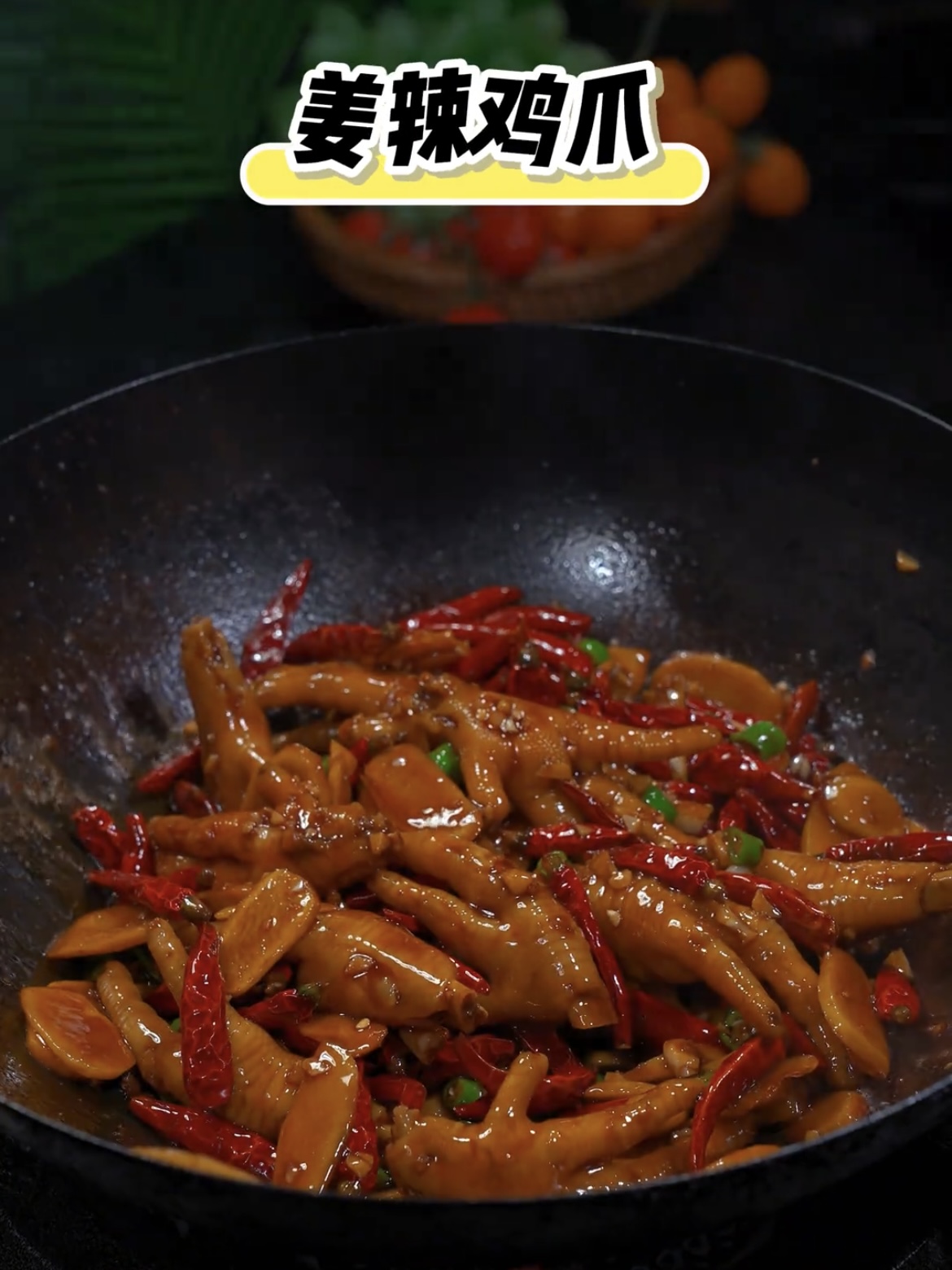 时间到之后呢,我们另起锅烧油,倒入挺多的生姜片和干辣椒,把它们炒出香味后,倒入鸡爪,翻炒均匀。最后加入:盐,蚝油,料酒,蒜末。再次把它们翻炒至均匀入味,再倒入青椒碎点缀,炒30秒后就可以出锅开吃了。