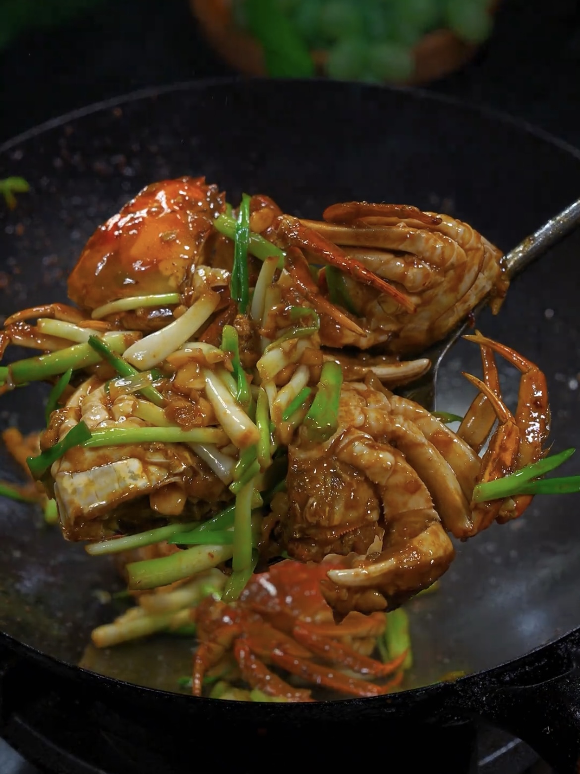 等到两面煎黄后加入蒜末和料酒,快速的翻炒10秒再加入生抽和葱头,再次翻炒30秒就可以出锅了,葱香浓郁,蟹肉鲜甜,好好吃。