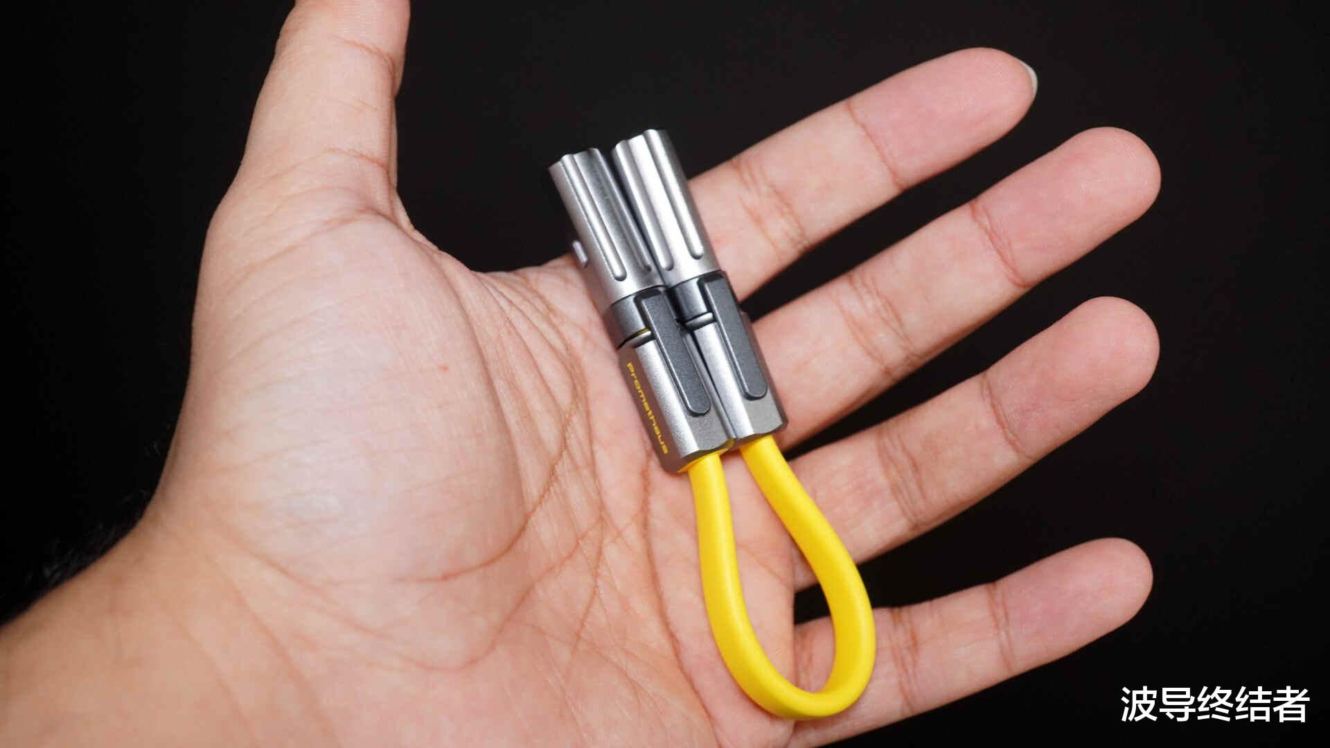 首先,它是一个双头Type-C的数据线,体积和重量都非常小。你可以将它作为挂绳或者钥匙扣的一部分随身携带,或者随手塞在背包EDC里,都几乎不占什么位置。中间的线材使用了液态硅胶材质,柔软度和弯折性适中,手感也很舒服。