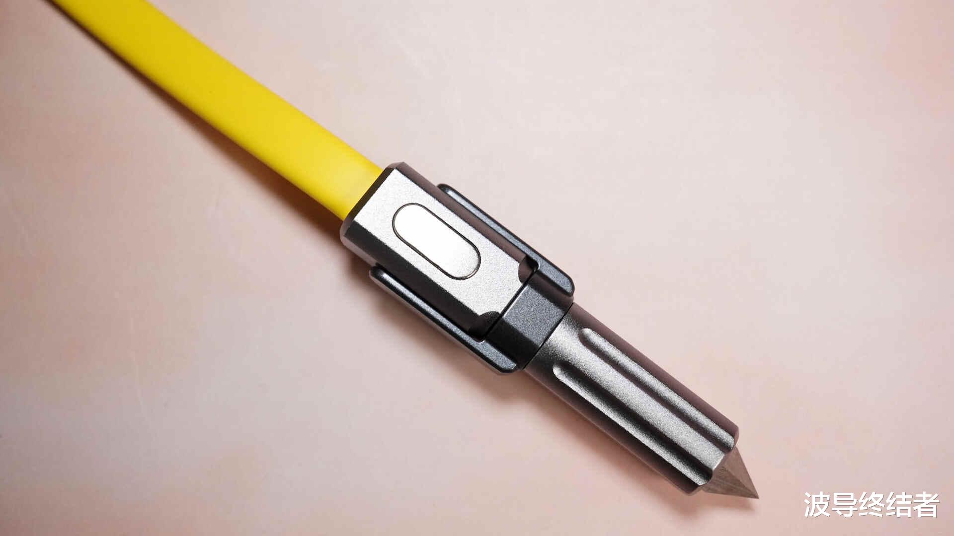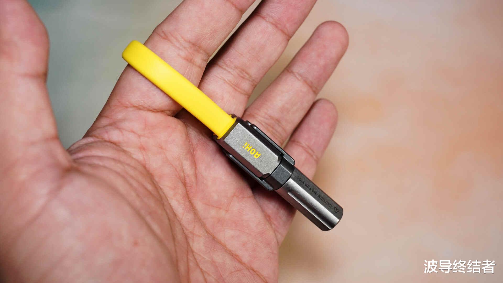 一头是点烟器,另一头则是隐藏式的伸缩钛合金刀头,确切的来说是尖头四面体的结构。通过手动旋转,才能将刀头伸出来,不用担心误触弹出之类的。