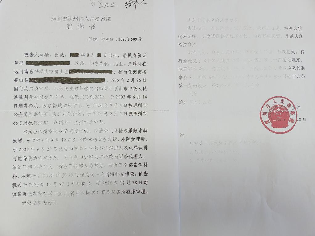 半年后,被涿州检察院以涉嫌“敲诈勒索罪”向涿州法院提起公诉。