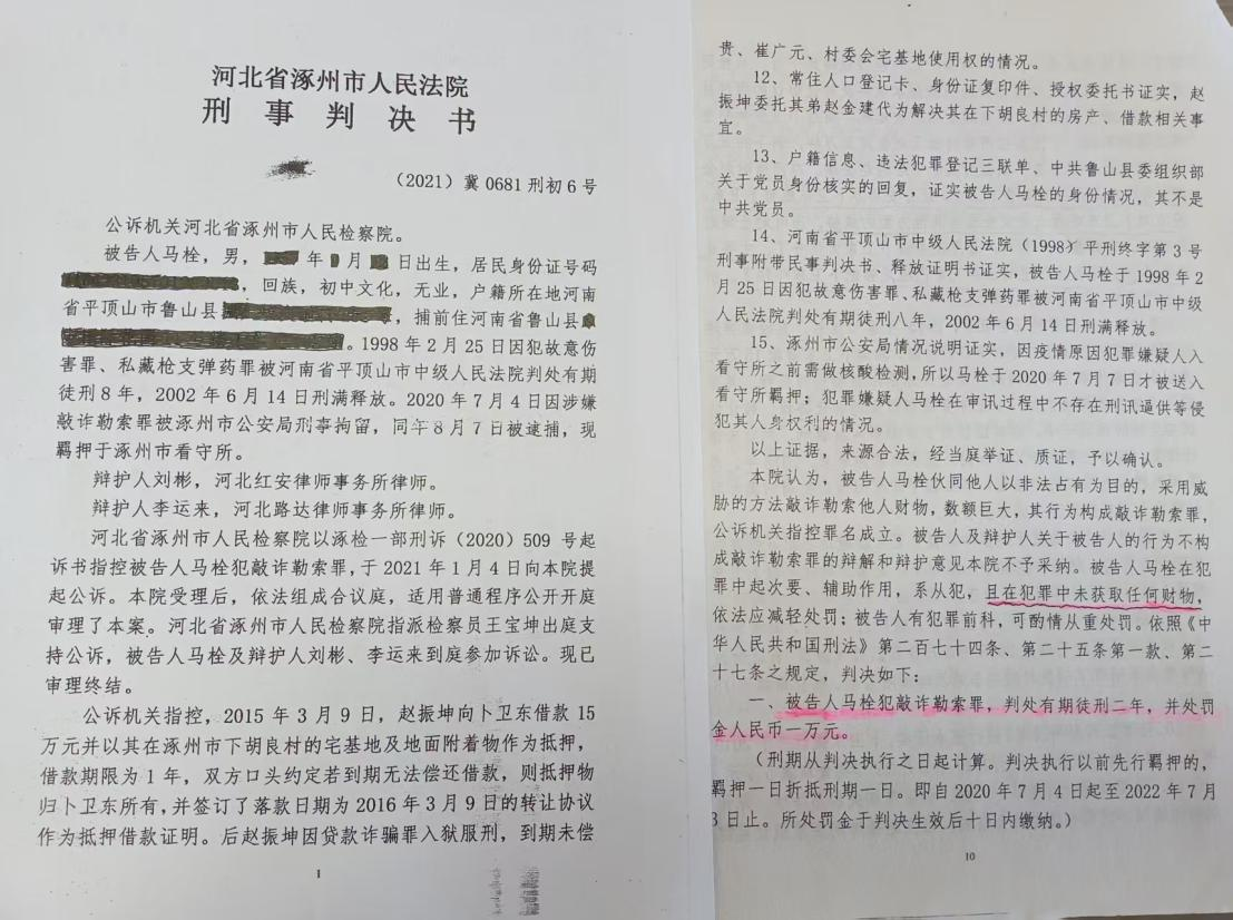 2021年3月31日,涿州法院以“敲诈勒索罪”判处马栓有期徒刑2年,并处罚金1万元。责令被告人马栓退赔被害人卜卫东人民币10万元。
