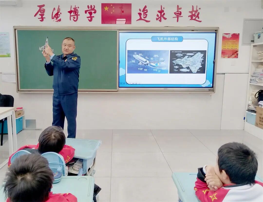 课堂的高潮莫过于对“空中小卫士”——战斗机的揭秘。郭叔叔向孩子们展示战斗机的模型,孩子们聚精会神地聆听了战斗机如“超级猎豹”般的超强能力,并通过短视频直观感受了其灵活敏捷的飞行姿态。