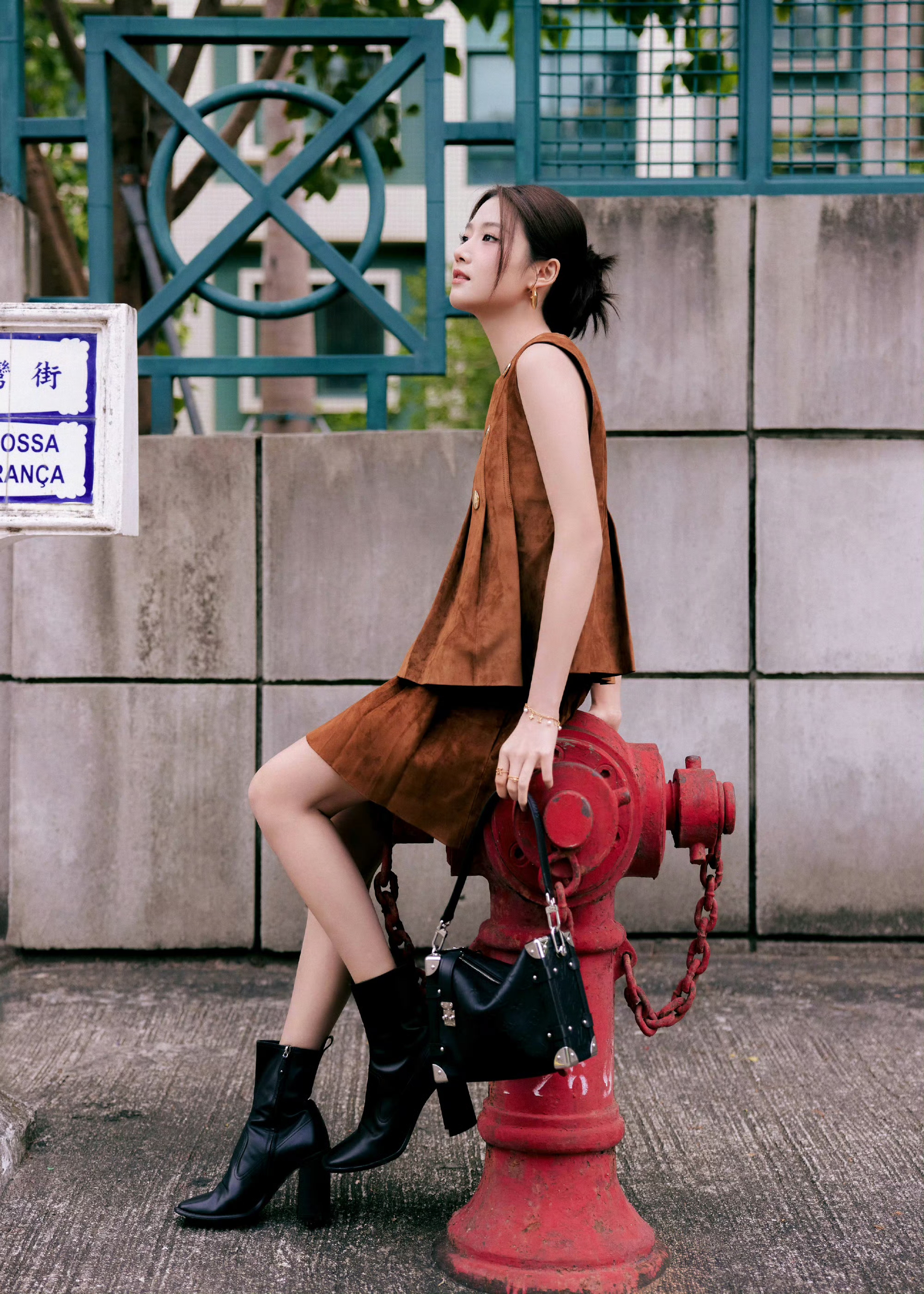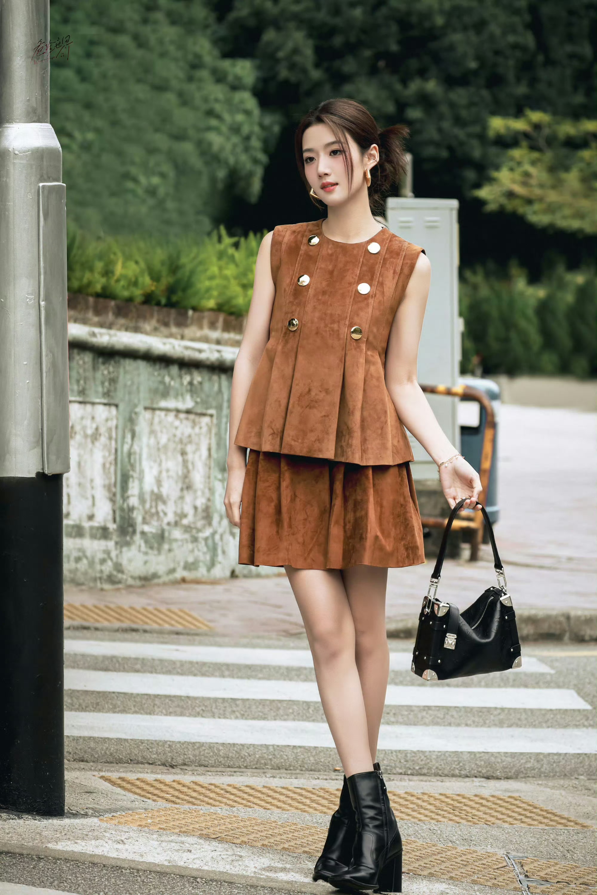 卢昱晓身穿焦糖色无袖套装,上衣金色双排扣自带复古韵味,同色系短裙利落有型,整体风格甜中带酷又不失优雅。