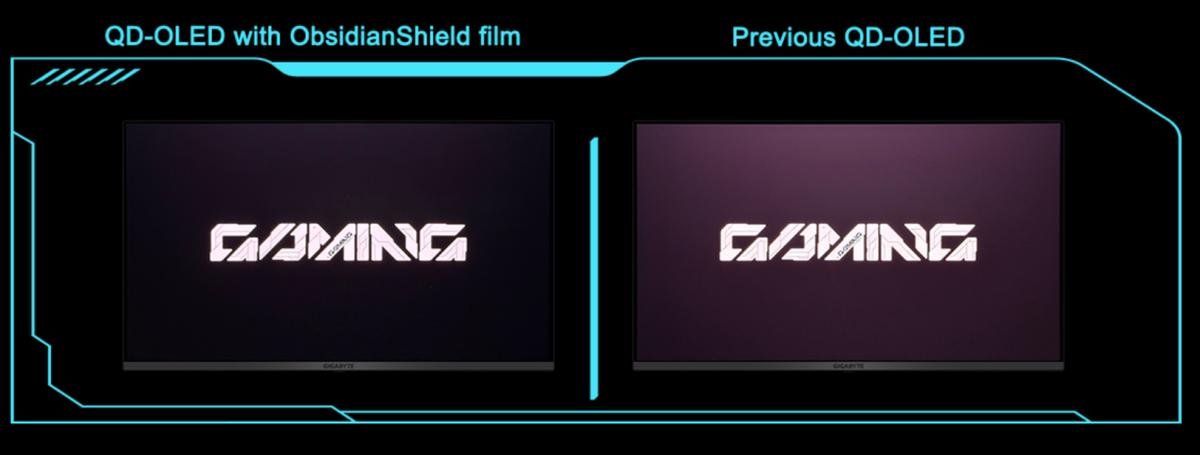 玩家长期使用中关注的抗反射、耐用性与护眼问题,技嘉也给出了针对性解决方案,进一步提升产品实用性与长期服役能力。该机搭载技嘉自研的ObsidianShield抗反射涂层,经实测,在日间自然光、直播补光灯等复杂环境光下,可实现最高40%的黑色位感知深度提升,彻底解决OLED面板易反光的痛点,非暗室环境下无需拉高亮度,就能清晰捕捉阴影区域敌人轮廓,避免反光造成的操作失误。屏幕表面硬度从2H升级至3H,防刮性能提升2.5倍,日常清洁、外设磕碰时可有效保护面板,降低维护成本。