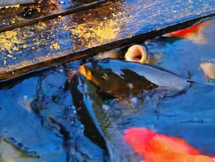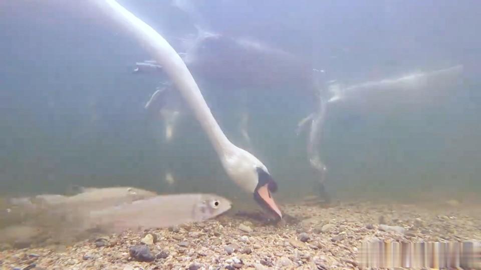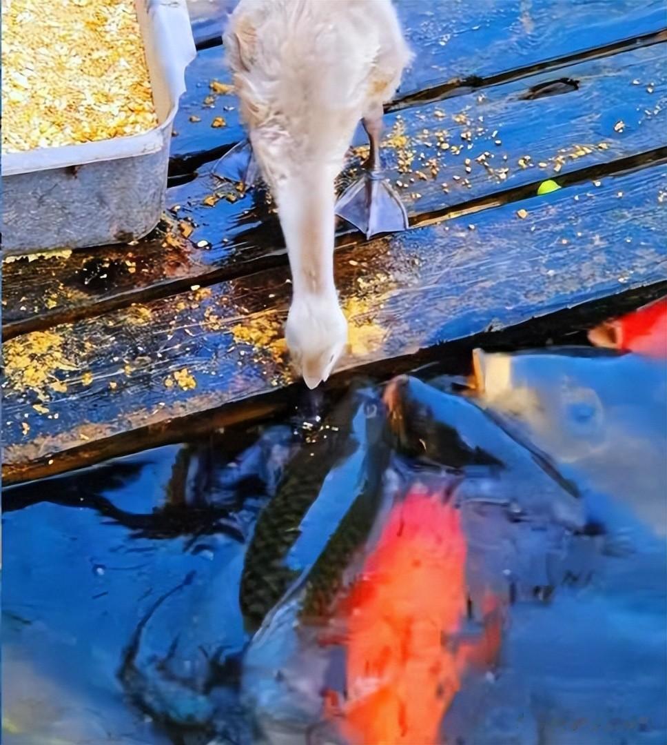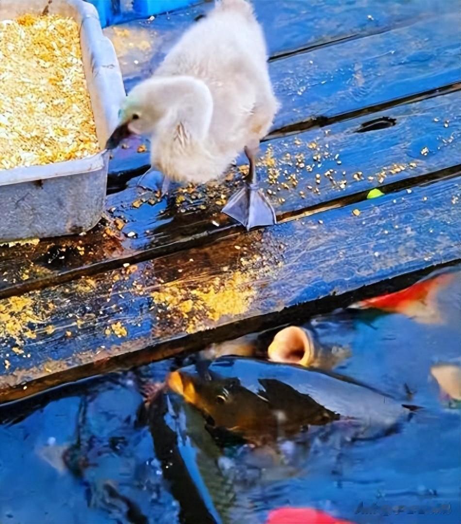 天鹅幼崽掉落的饲料残渣富含碳水化合物和蛋白质,是鱼类理想的能量来源。而鱼类会将天鹅的活动与食物供应建立关联。当天鹅幼崽靠近食盆时,鱼类会主动游向其喙部下方等待食物,这种行为是典型的条件反射。