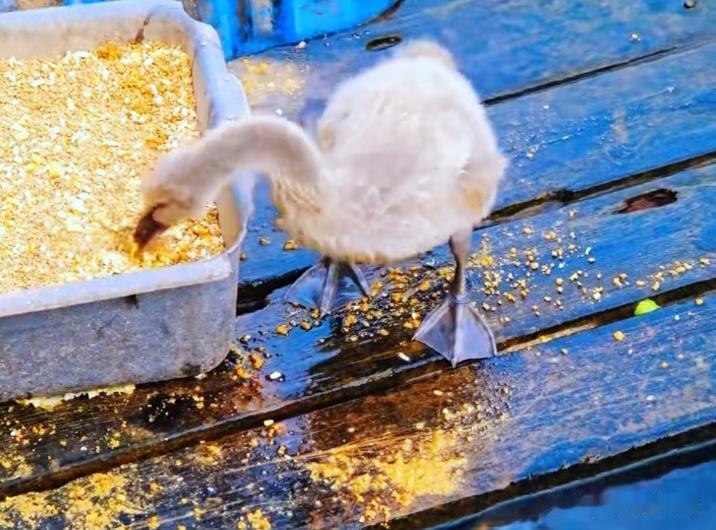 而视频中食盆中的饲料为人工混合的颗粒料,其硬度高于昆虫、鱼类等自然食物。而天鹅的进食系统构造特殊,虽然喙缘有细密的锯齿状栉板,能在啄食水生植物时切断纤维并过滤水分,却没有牙齿,无法咬碎食物,只能不咀嚼通过食道直接吞咽,后续在嗉囊软化食物。