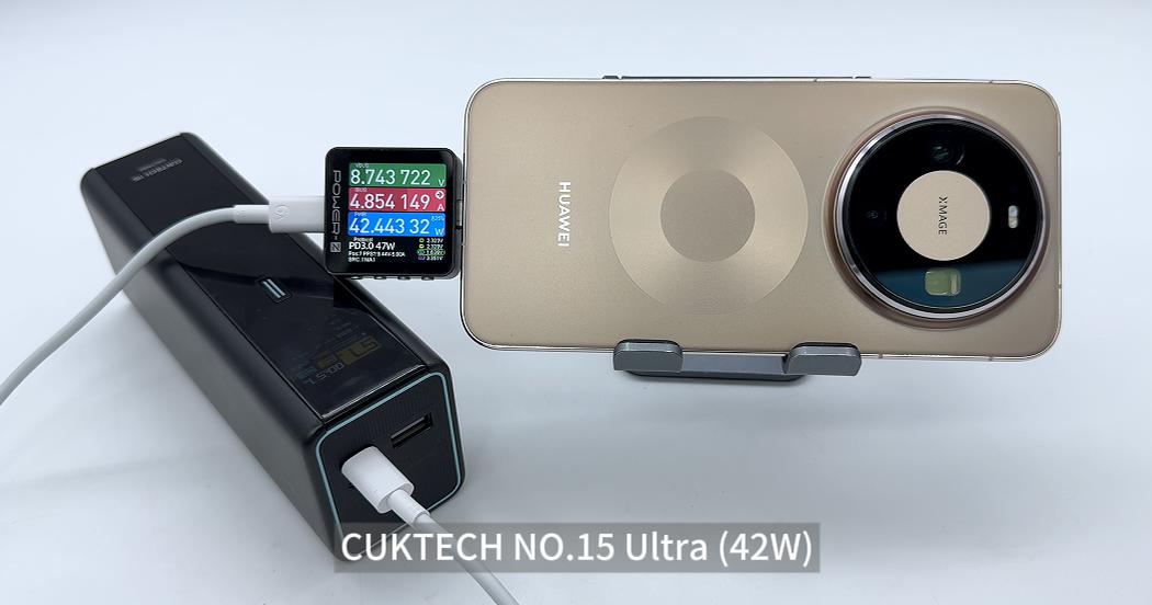 CUKTECH NO.15 Ultra 充电宝为华为Mate80 Pro充电,同时使用POWER-Z KM003C测试仪读取充电功率为8.74V 4.85A 42.44W,握手的协议为PPS协议。