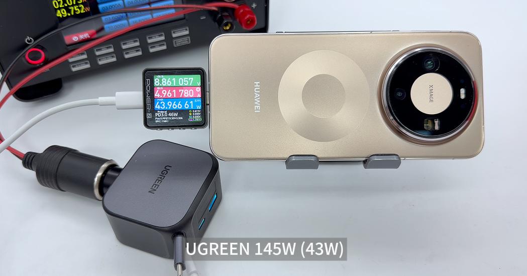 UGREEN 145W车充为华为Mate80 Pro充电,同时使用POWER-Z KM003C测试仪读取充电功率为8.86V 4.96A 43.97W。